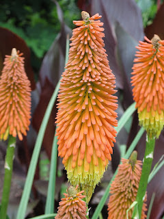 One of the groups of plants that I have always admired–even lusted after–but have never experimented with much is Kniphofia, the “red hot pokers”. Even as a child, I remember seeing those full color pictures in the Wayside Gardens catalog (and many others) and thinking that there just couldn’t be a much prettier or more impactful flower. I don’t know whether it was just the flowers, which looked to me like some sort of fanciful orange fireworks bursting in mid-air, or if I had already started a lifelong love affair with all things “spiky” and sword-like in texture. Probably, it was a combination of the two, even if I didn’t know it at the time. That affair carries on today and, I have to admit, it carries on torridly with a Kniphofia named ‘Lola’.