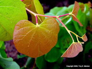 …..the new redbuds coming to market in the very near future. Some friends and I took a trip to Winchester on Friday and stopped to see Harold and Alex Neubauer (all I can say about their nursery is WOW!) before heading on over to see our good friend and horticulture guru, Don Shadow. Don took the time out of his busy day to treat us to lunch and then showed us to the far corners of the nursery where the best-of-the-best called to us from across the acres. One of the most beautiful was the plant pictured here–Cercis canadensis ‘Rising Sun’–with golden yellow foliage providing the perfect foil for the coppery-orange new growth and all of it (old foliage and new) highlighted with brilliant, hot pink petioles! This is my kind of plant! Flowering in spring, its blossoms will be the typical redbud color.